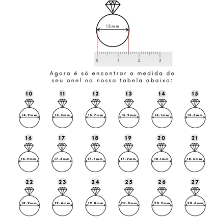Escolha um anel que você já use e ache confortável. Com uma régua você deverá medir a parte interna do aro, de uma extremidade a outra, assim como na imagem: