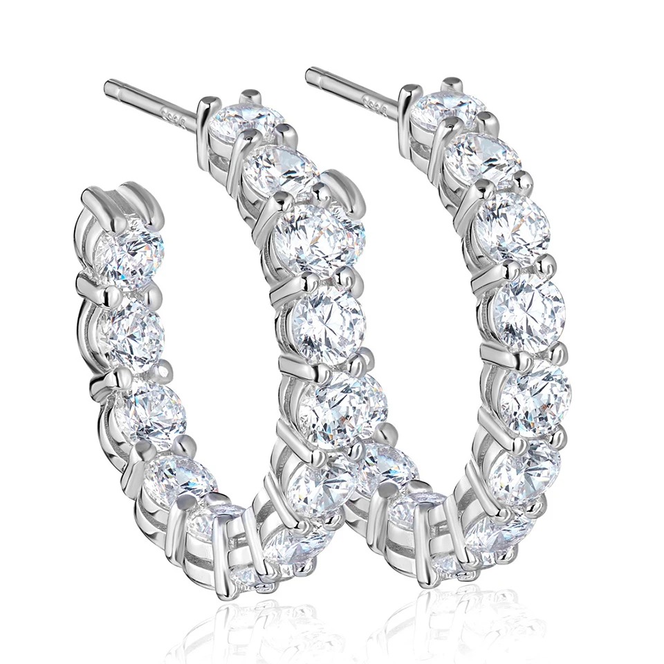 "Uma ode à modernidade e ao luxo. Este brinco argola, com design minimalista e sofisticado, é confeccionado moissanites, com seu brilho excepcional, conferem um toque de glamour e exclusividade à peça, sua estrutura em prata 925 e banhado em um processo revolucionário de galvanoplastia com camadas de platina, ródio e ouro branco 18k, garantindo um brilho eterno e hipoalergênico. Perfeito para mulheres que buscam joias com design contemporâneo e qualidade superior."